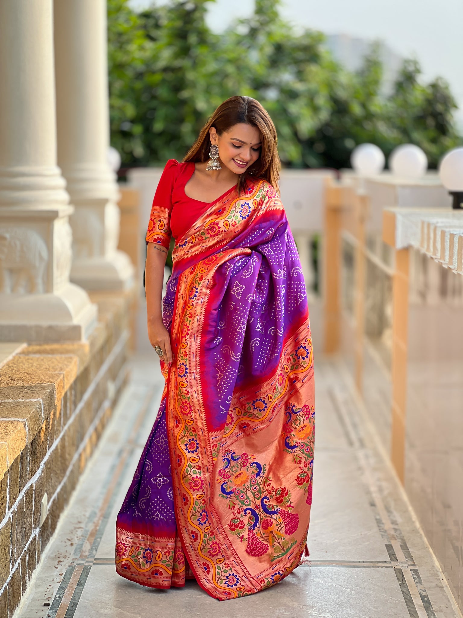 Drape yourself in timeless elegance with this Soft Pethani Silk Saree, exquisitely crafted to blend traditional charm with modern finesse. This saree features intricate Zari weaving complemented by vibrant Meenakari Bandhej designs, adding depth and cultural richness to every drape.