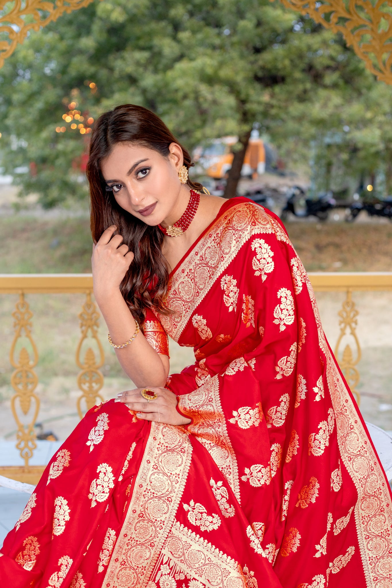 Crafted in luxurious Mushro satin silk, this Banarasi saree features intricate zari weaving all over the body, showcasing timeless elegance and rich craftsmanship.