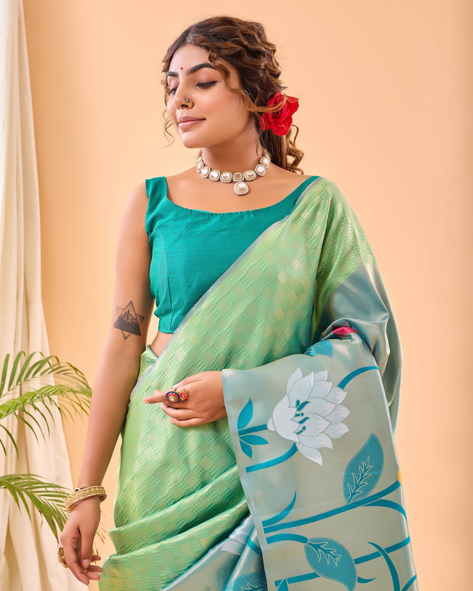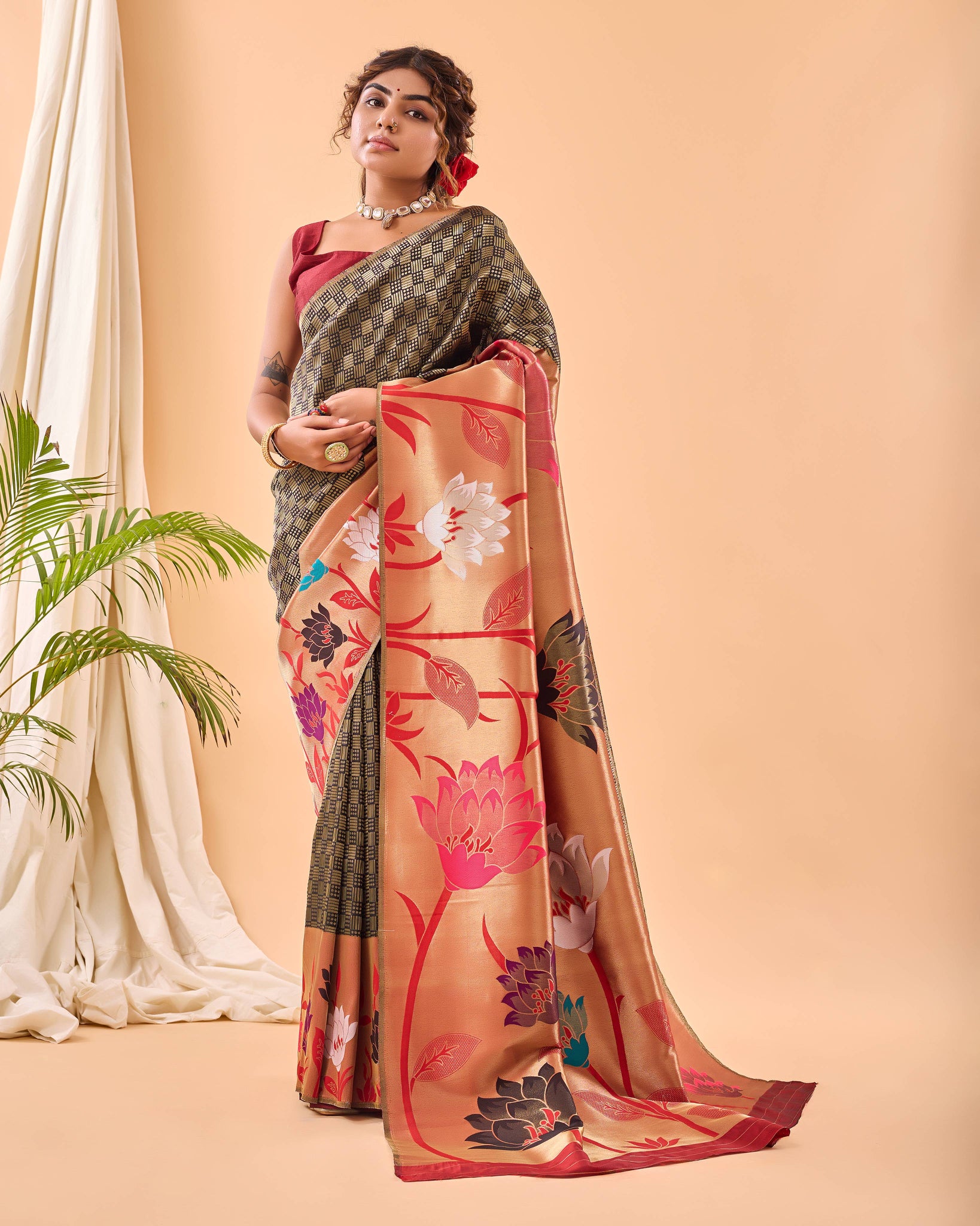 This pure Paithani silk saree features a broad Paithani border, adorned with intricate Meenakari motifs for a rich, traditional look. It comes with a contrast richly woven pallu, border, and matching contrast blouse piece.