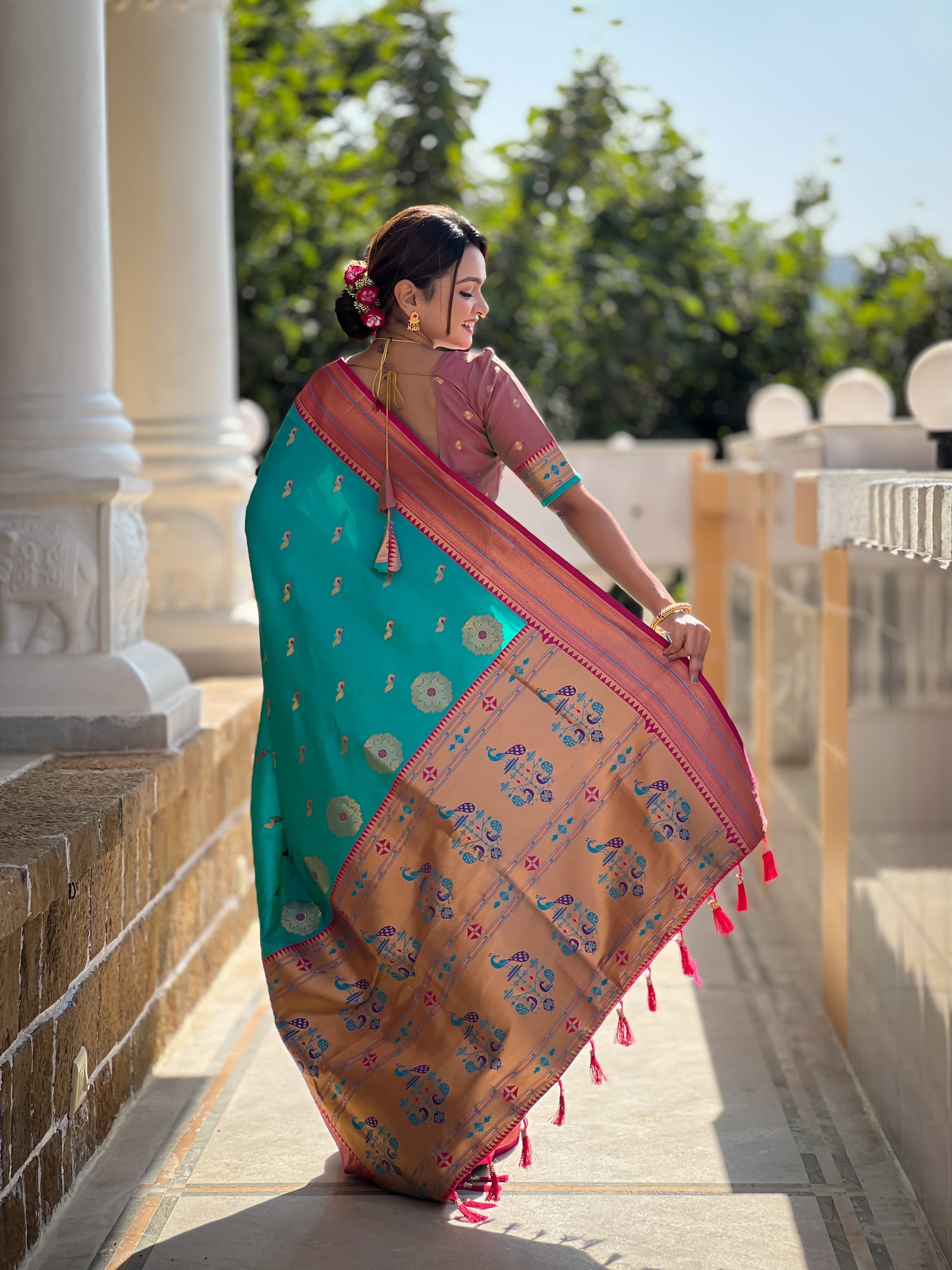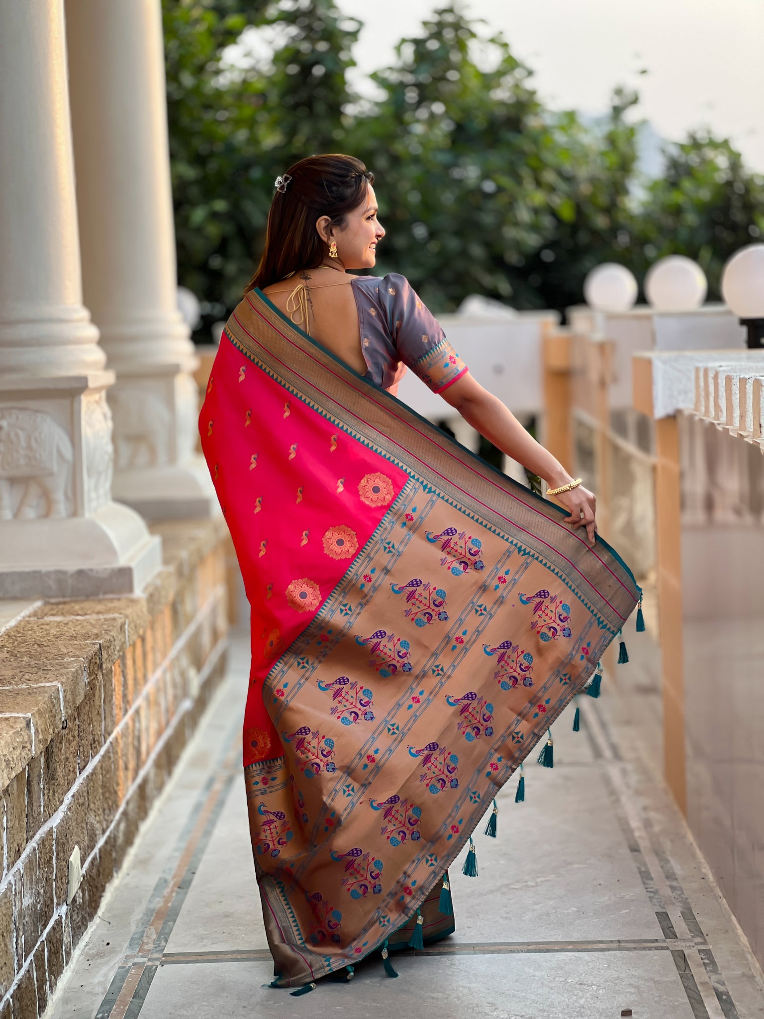 The saree is adorned with a Meenakari woven rich pallu, finished with delicate tassels at the end, and bordered with an ornate Meenakari zari weave for a regal touch.