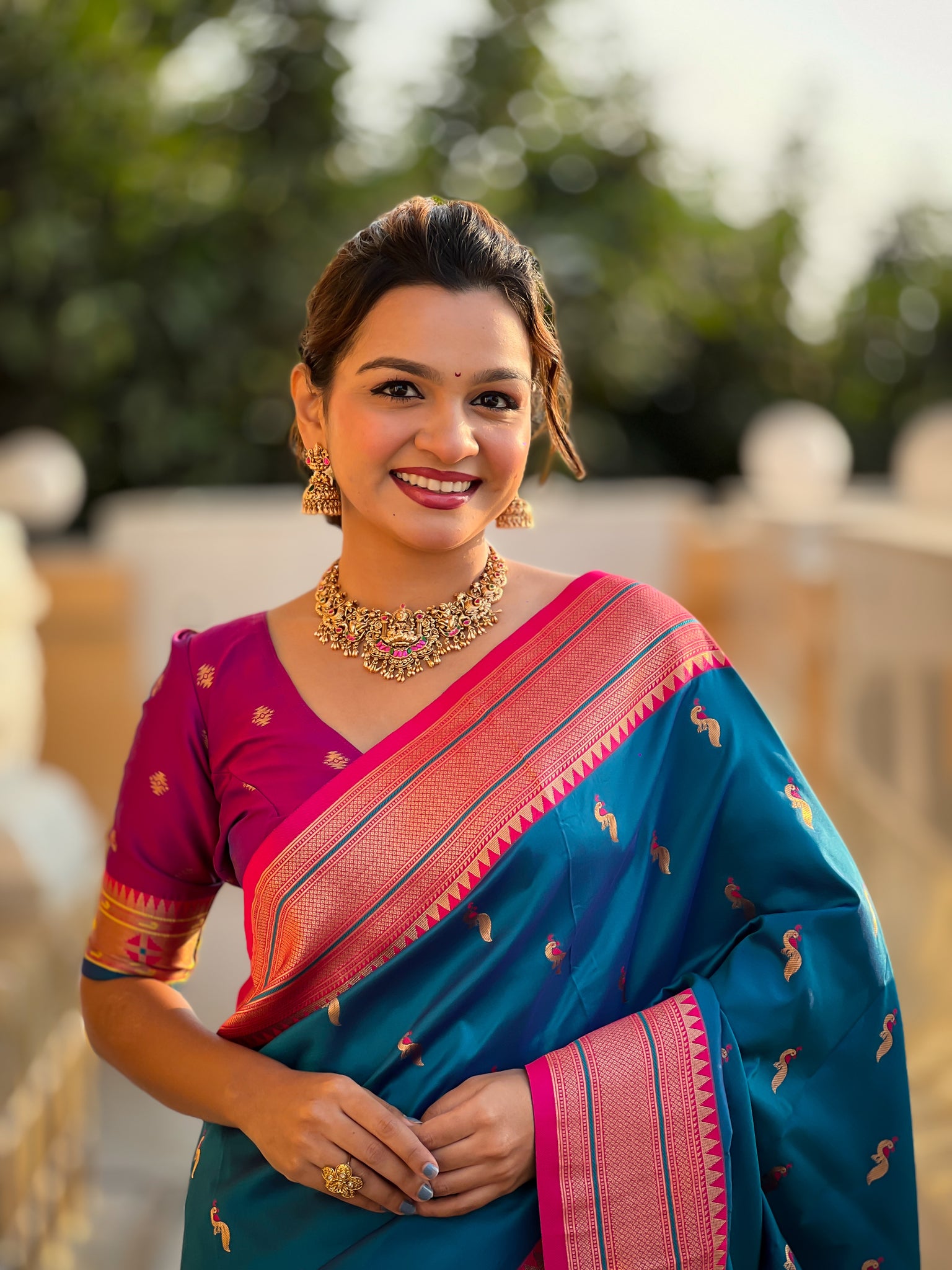 Drape yourself in timeless elegance with this Soft Pethani Silk Saree, exquisitely crafted to blend traditional charm with modern finesse. This saree features intricate Zari weaving complemented by vibrant Meenakari Bandhej designs, adding depth and cultural richness to every drape.