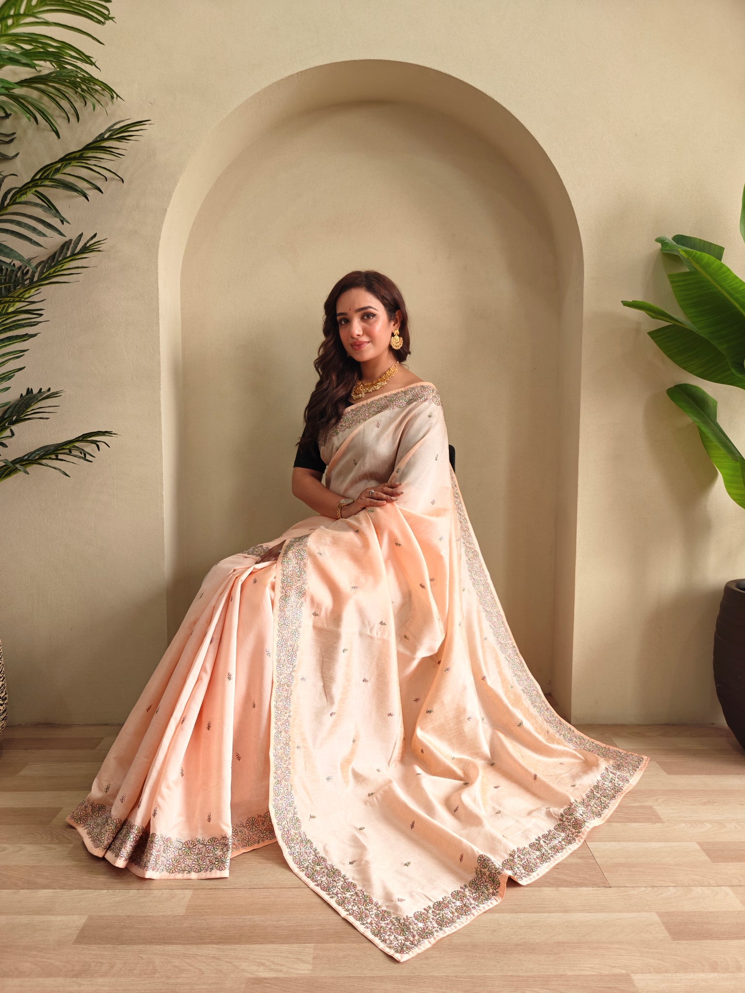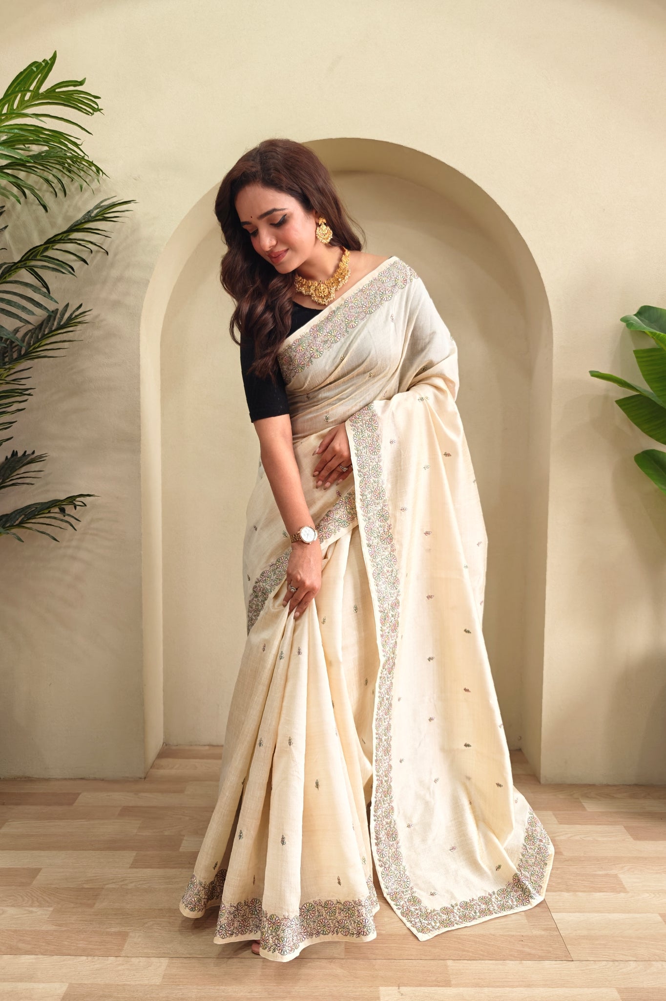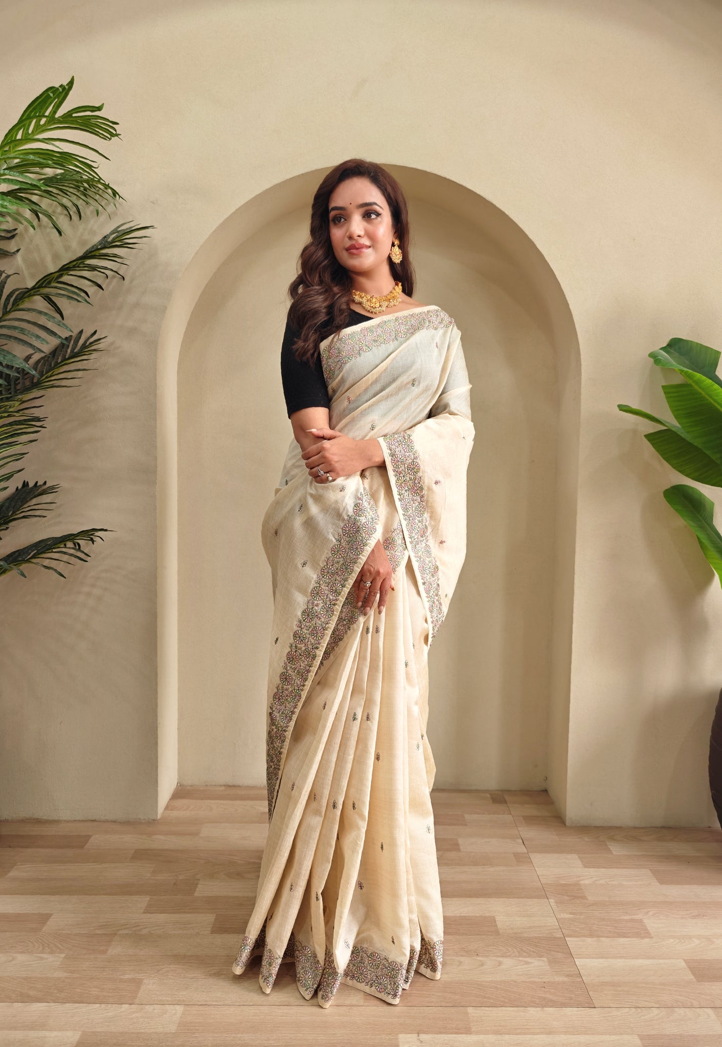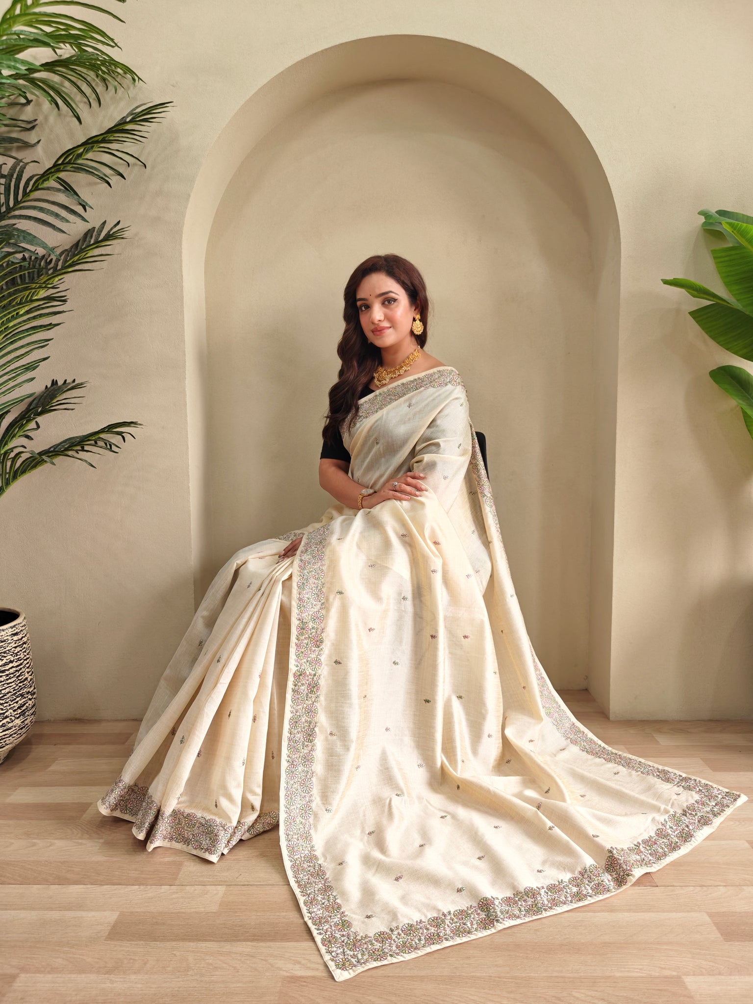 This pure loom Tussar silk saree features intricate all-over designer embroidery, paired with a beautifully embroidered pallu and border. A perfect blend of tradition and elegance, ideal for festive and special occasions.
