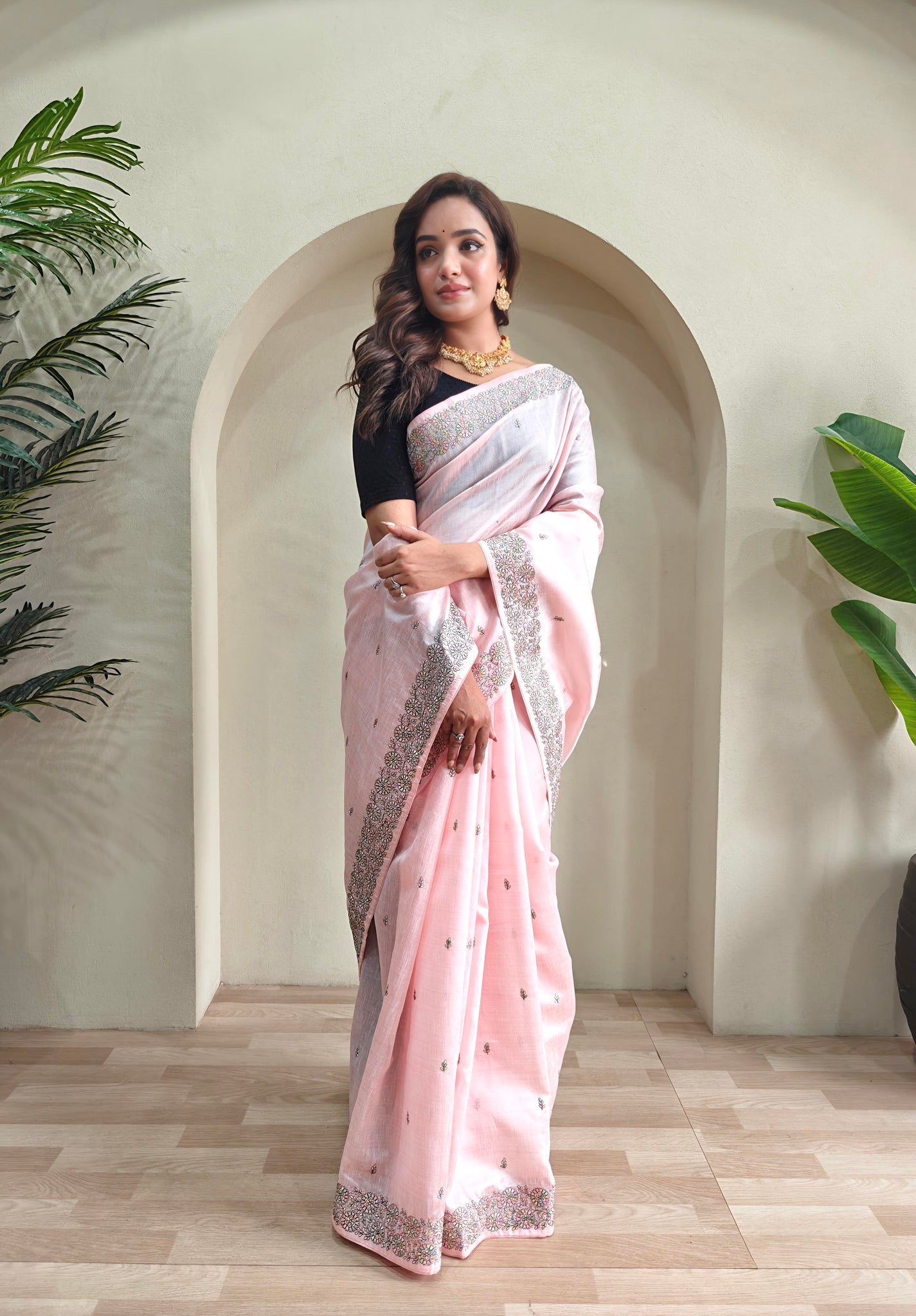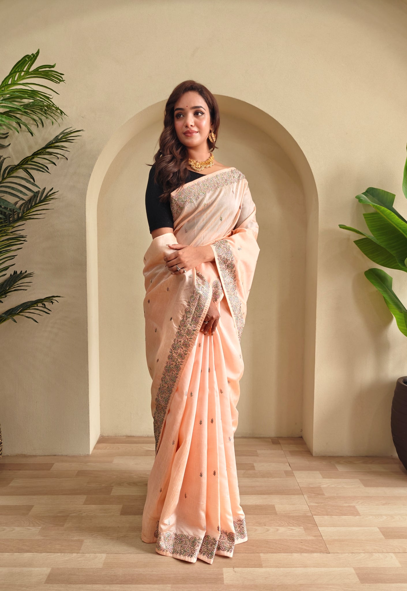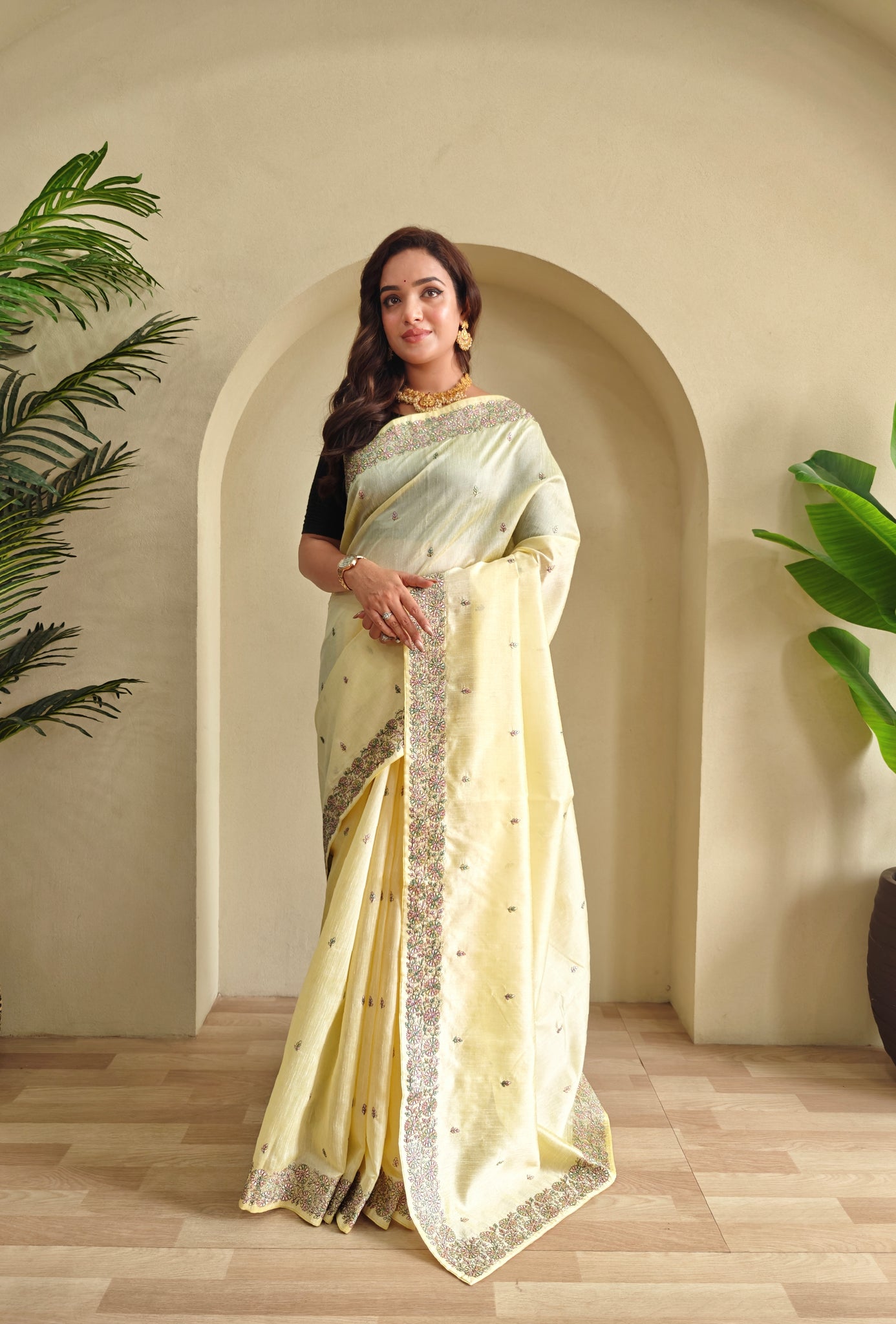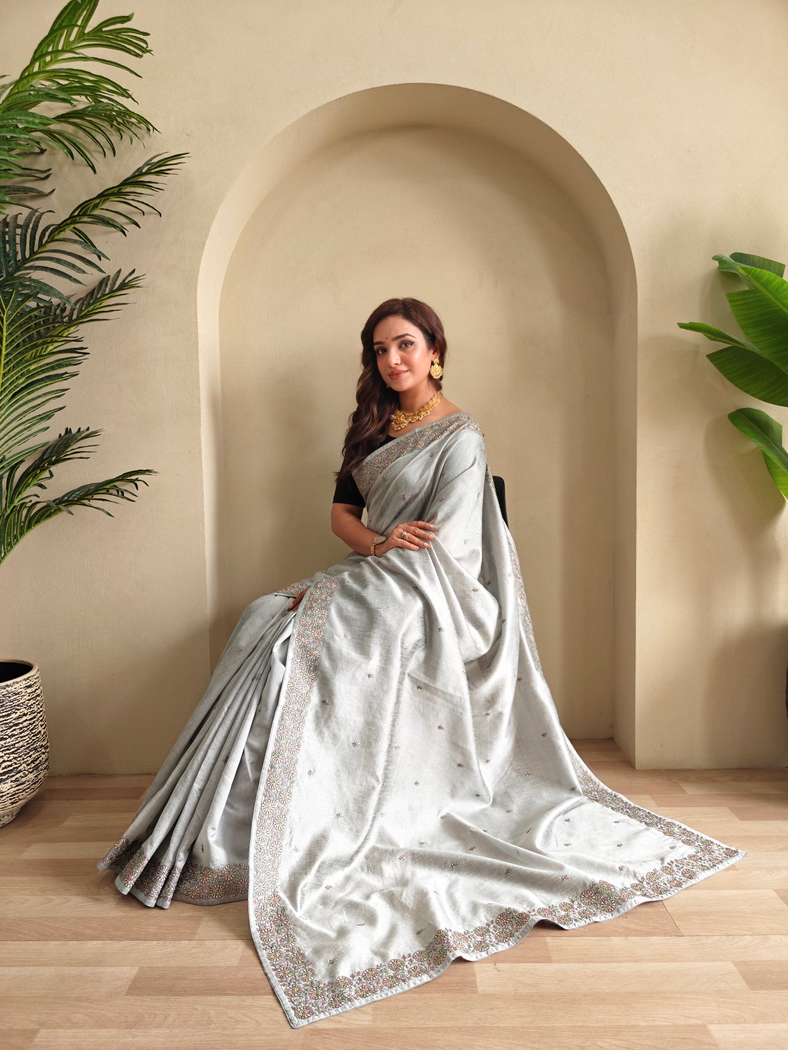 This pure loom Tussar silk saree features intricate all-over designer embroidery, paired with a beautifully embroidered pallu and border. A perfect blend of tradition and elegance, ideal for festive and special occasions.