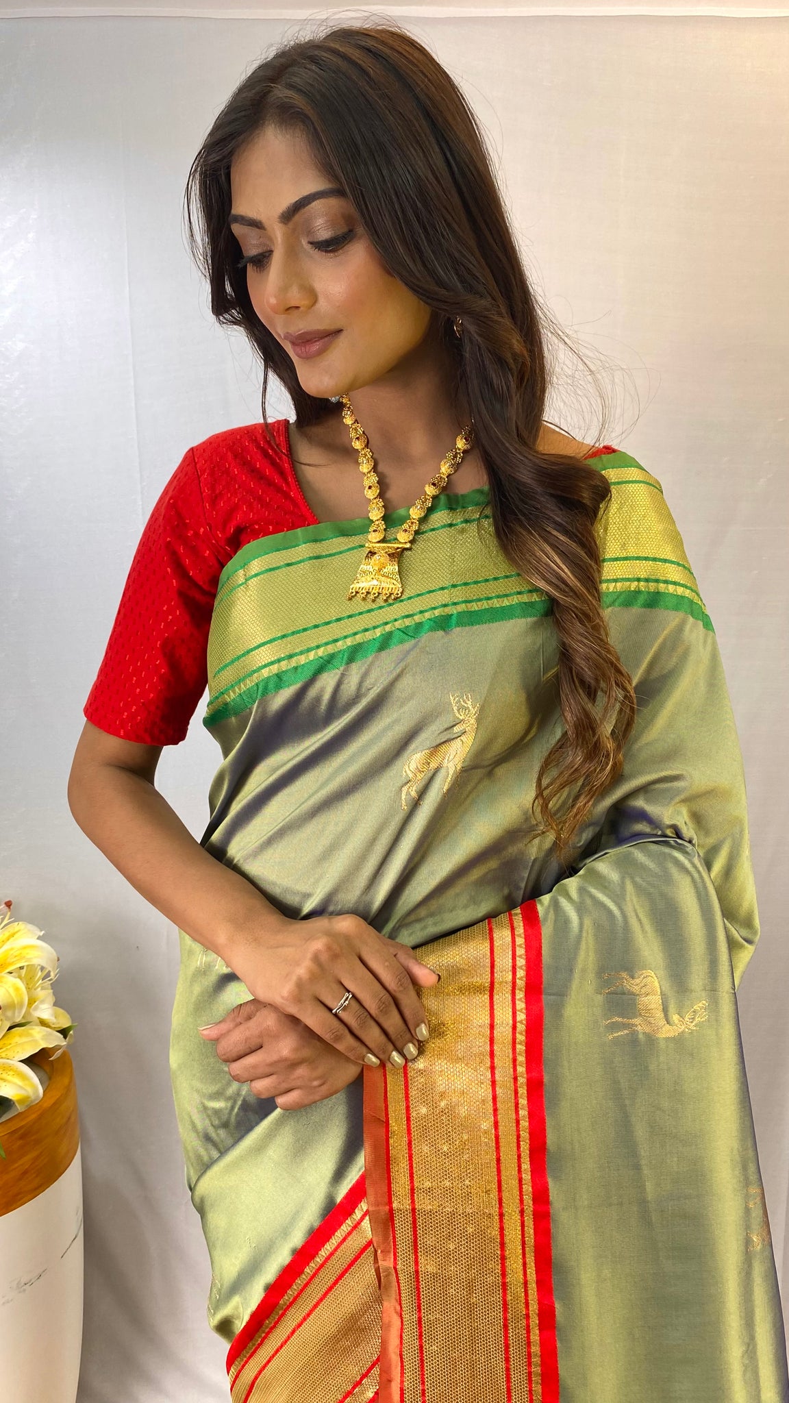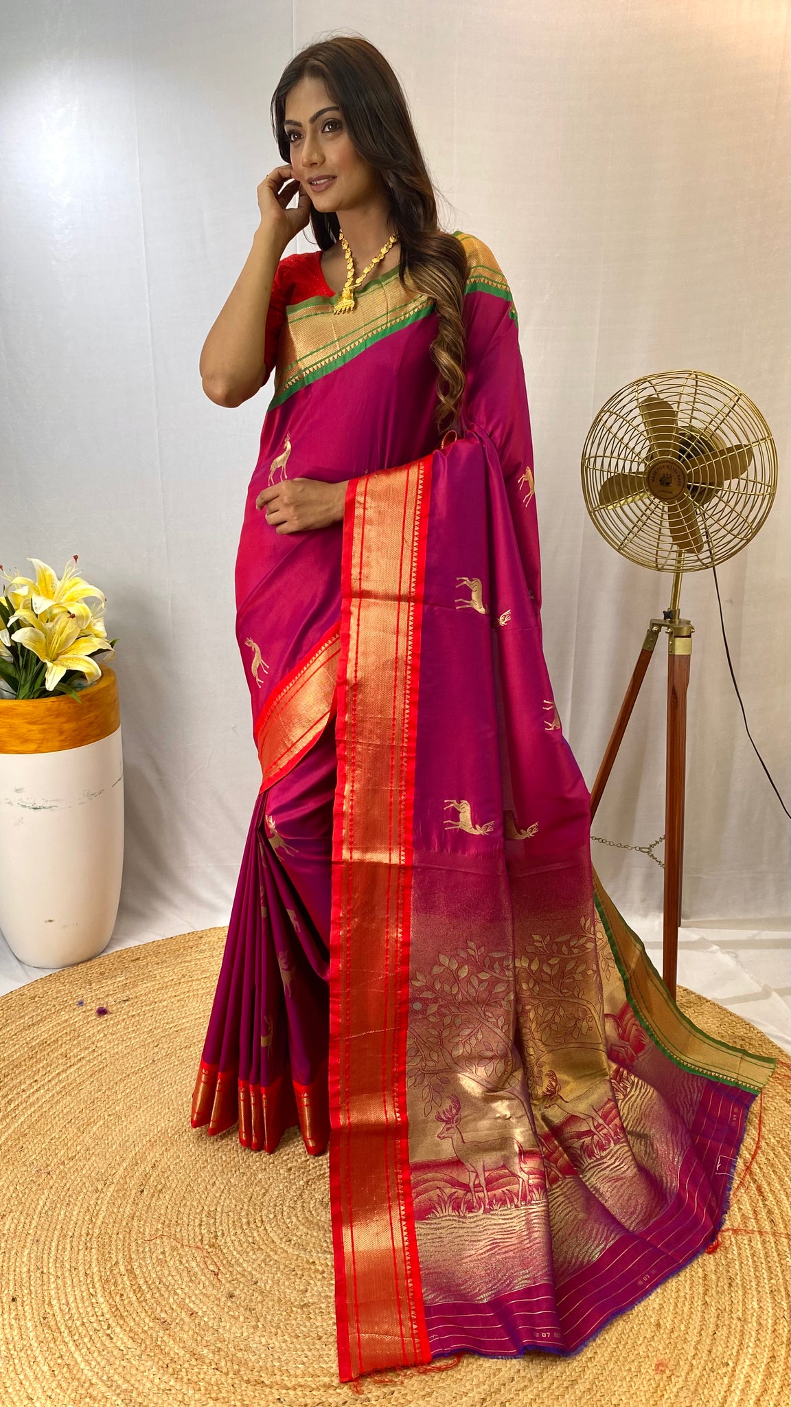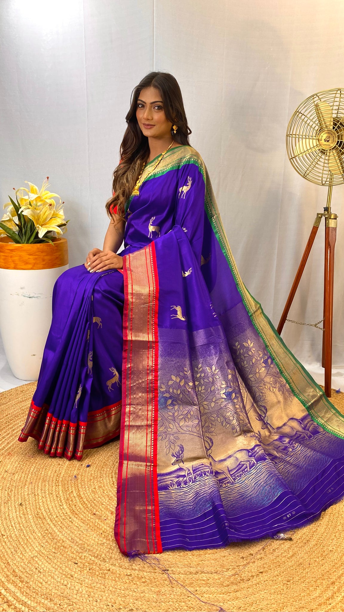Inspired by nature's grace, this pure soft silk saree features elegant deer motif designs woven across the body, symbolizing beauty and serenity. The Ganga Jamuna border adds a traditional touch, complemented by a richly woven pallu for a regal finish.