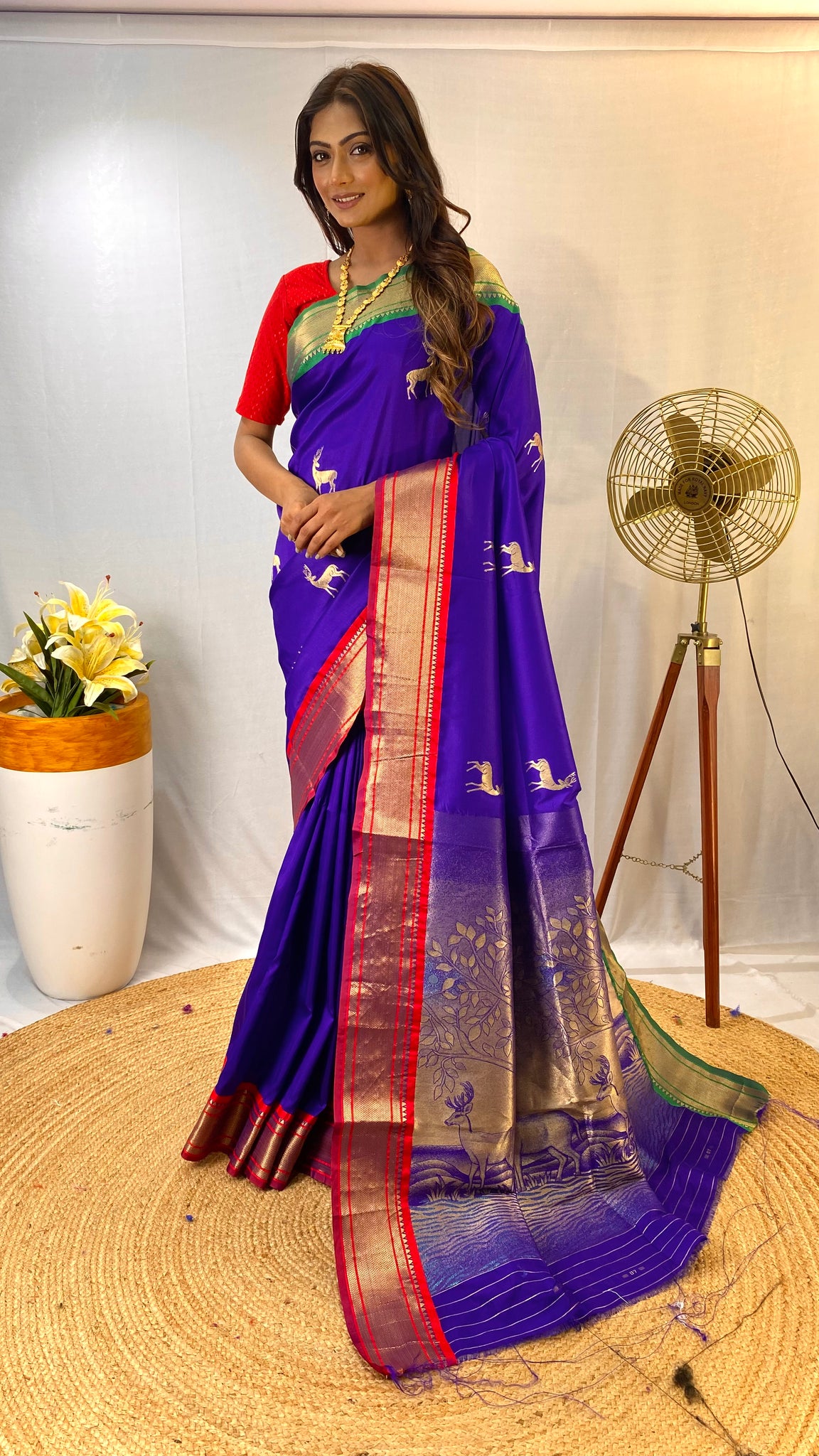 Blouse: Comes with a matching running blouse, beautifully woven with deer motifs on the back, enhancing the overall look with a stunning detail.