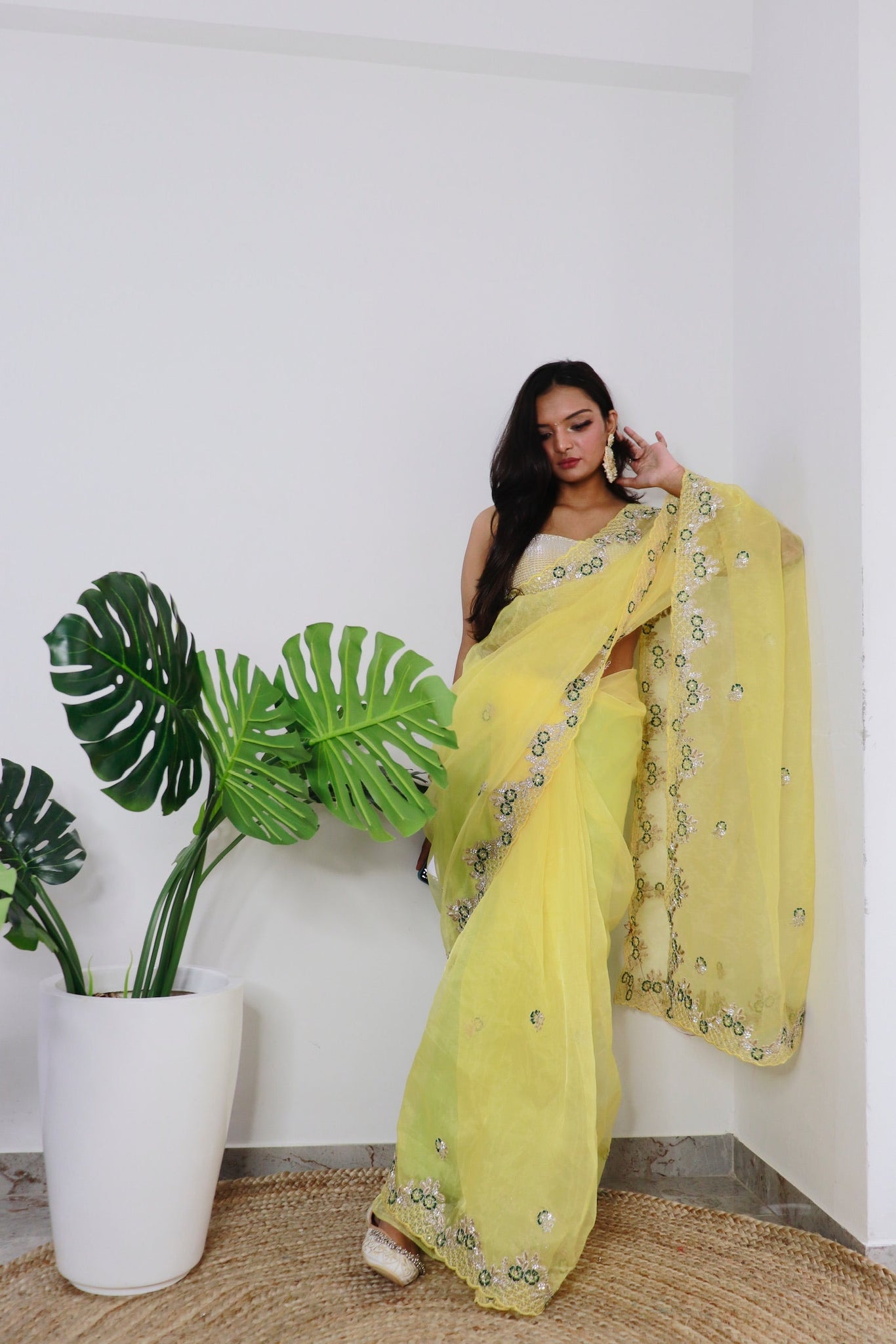 Step into soft sophistication with this yellow organza saree, delicately adorned with hand-embroidered floral motifs in thread and sequin work. The sheer elegance of the organza fabric gives the drape an ethereal float, perfect for both day celebrations and evening festivities.